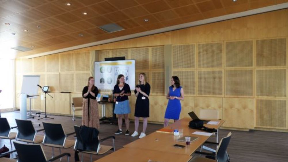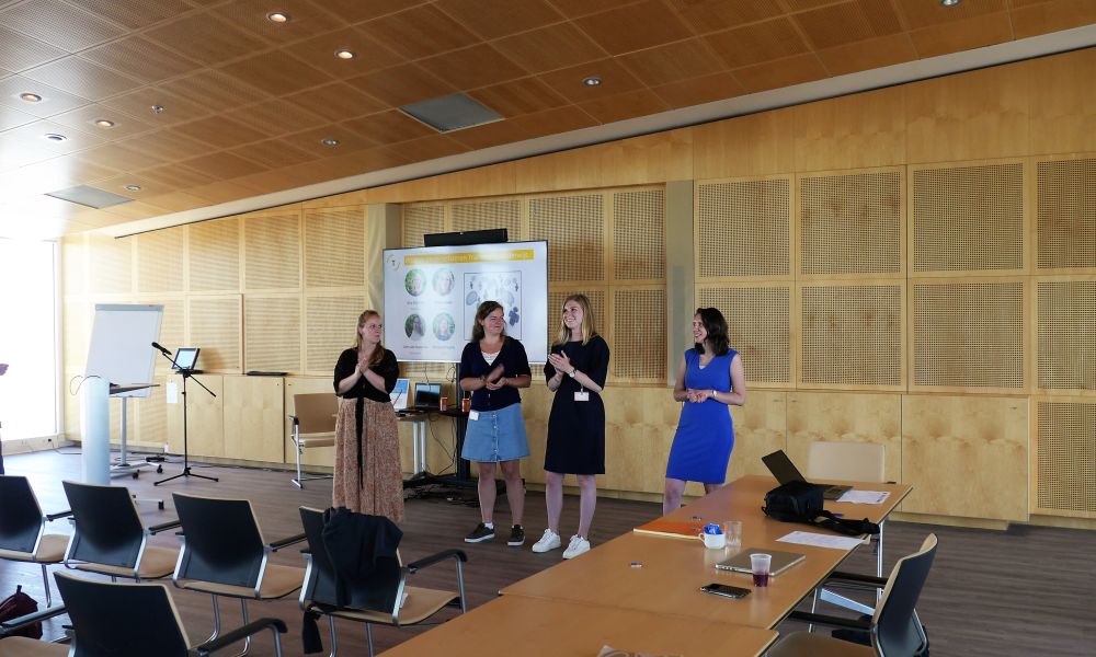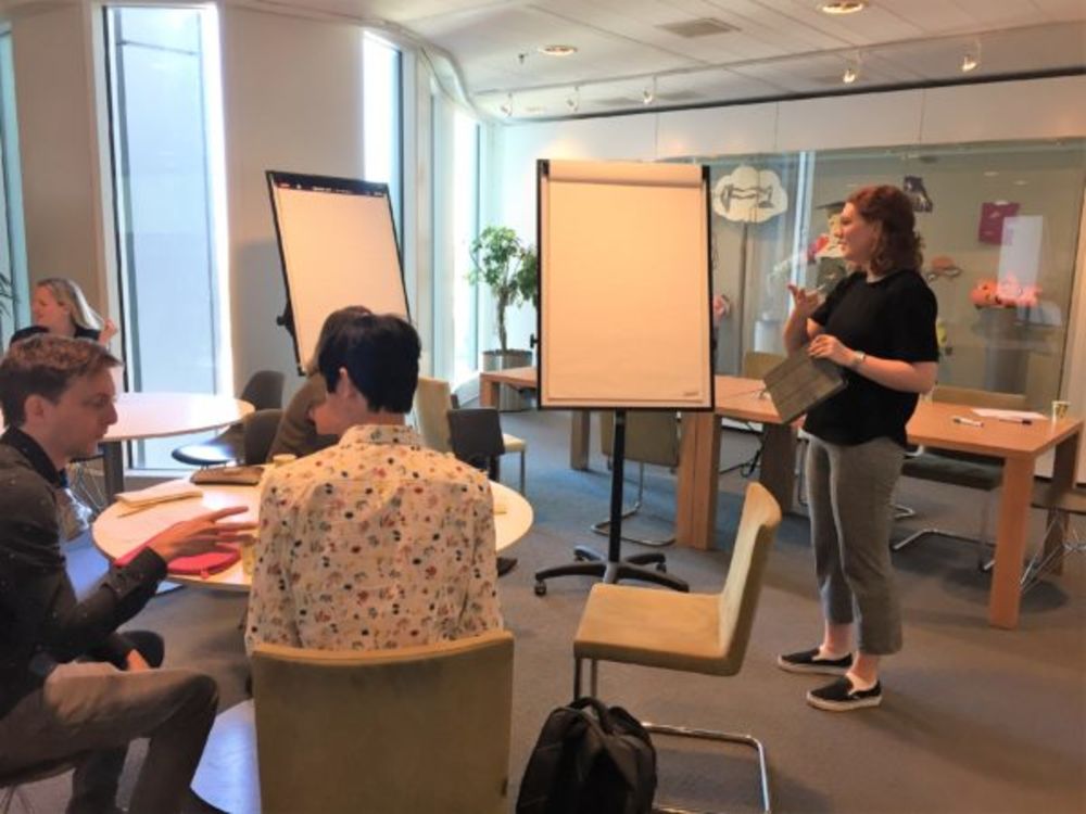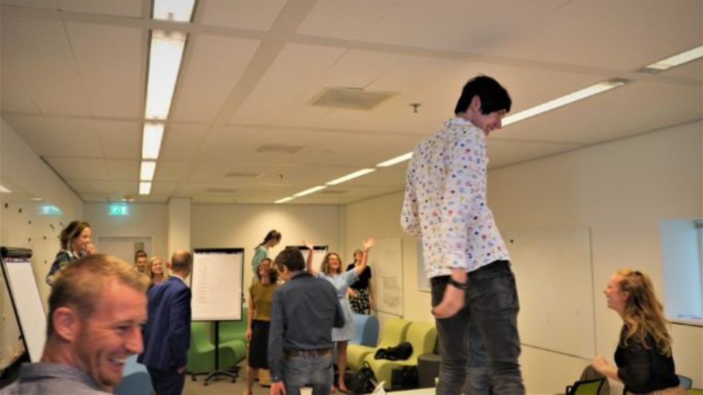 Dat een presentatie en pitch in elkaar zetten geenpiece of cakeis, bleek uit de workshop pitchen die Maike Pollaert op 28 juni verzorgde. Een interactieve ochtend waarin theatertechnieken werden besproken én geoefend. Zo stonden er op een gegeven moment bijna alle trainees op een tafel hun naam naar elkaar te roepen. De trainees gingen vervolgens in groepjes uiteen om onder leiding van de vier projectpoolers de pitch inhoudelijk en visueel te perfectioneren.